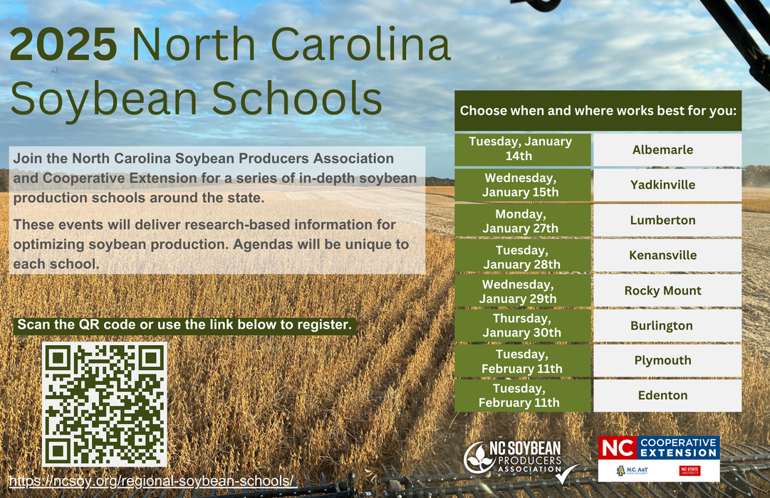North Carolina Soybean Schools are back for year two! Join the North Carolina Soybean Producers Association and Cooperative Extension for a series of soybean production schools around the state. These events deliver research-based information for optimizing soybean production. Agendas will be unique to each school.